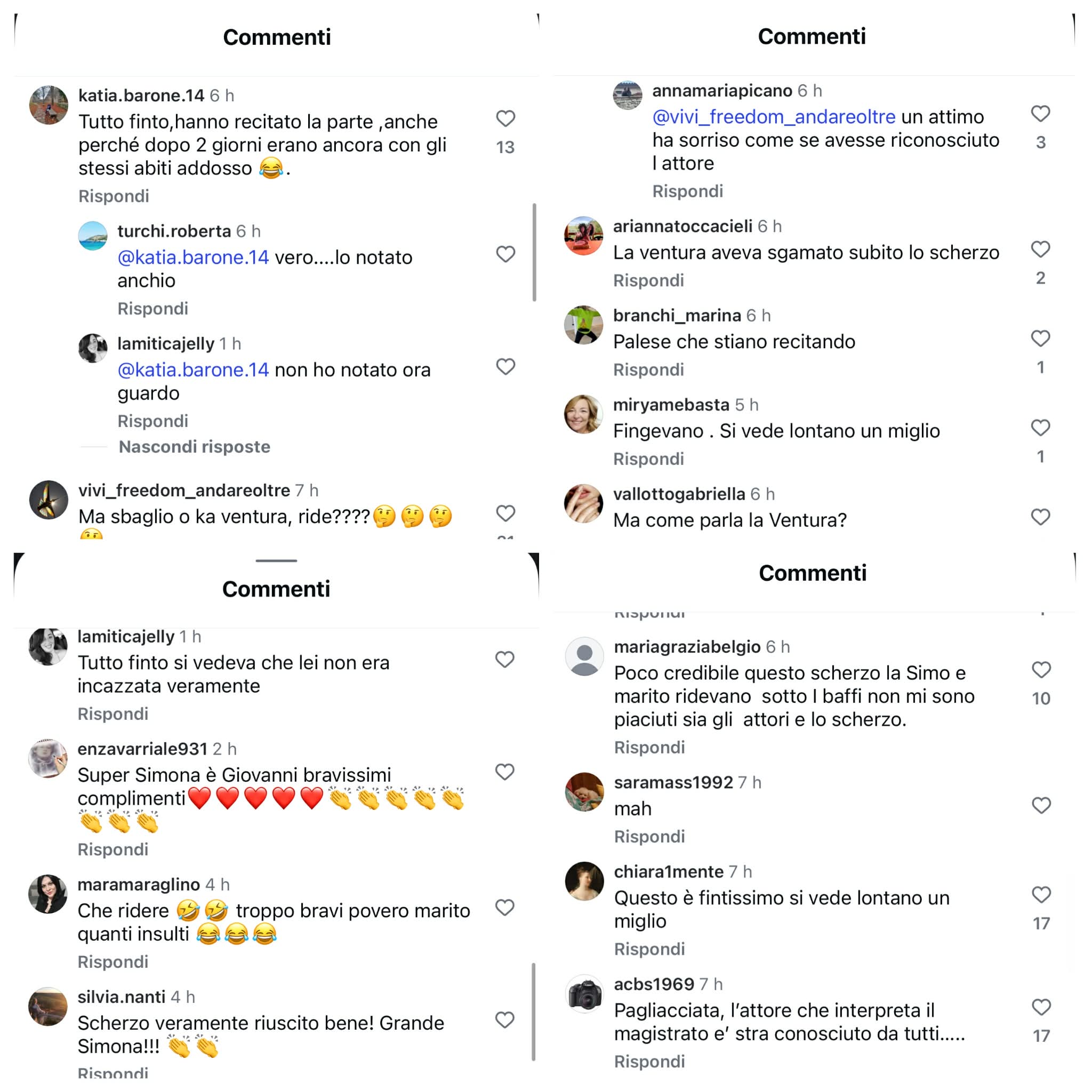 Molti utenti, infatti, hanno pensato che lo scherzo fosse palesemente finto. @katia.barone.14 ha scritto: “Tutto finto, hanno recitato la parte, anche perché dopo due giorni erano ancora con gli stessi abiti addosso“. @turchi.roberta le ha risposto: “Vero….lo notato anch’io“. @annamariapiccano ha commentato: “Un attimo ha sorriso come se avesse riconosciuto l’attore“. @ariannatoccacieli ha detto: “La Ventura aveva sgamato subito lo scherzo“. @branchi_marina ha scritto: “Palese che stiano recitando“. @miriyamebasta ha aggiunto: “Fingevano. Si vede lontano un miglio“. E ancora @mariagraziabelgio ha commentato: “Poco credibile questo scherzo la Simo e marito ridevano sotto i baffi non mi sono piaciuti sia gli attori e lo scherzo.” @chiara1mente ha scritto: “Questo è fintissimo si vede lontano un miglio“. @acbs1969 ha detto: “Pagliacciata, l’attore che interpreta il magistrato e’ stra conosciuto da tutti…..”. @lamiticajelly ha ribadito: “Tutto finto si vedeva che lei non era arrabbiata veramente“.