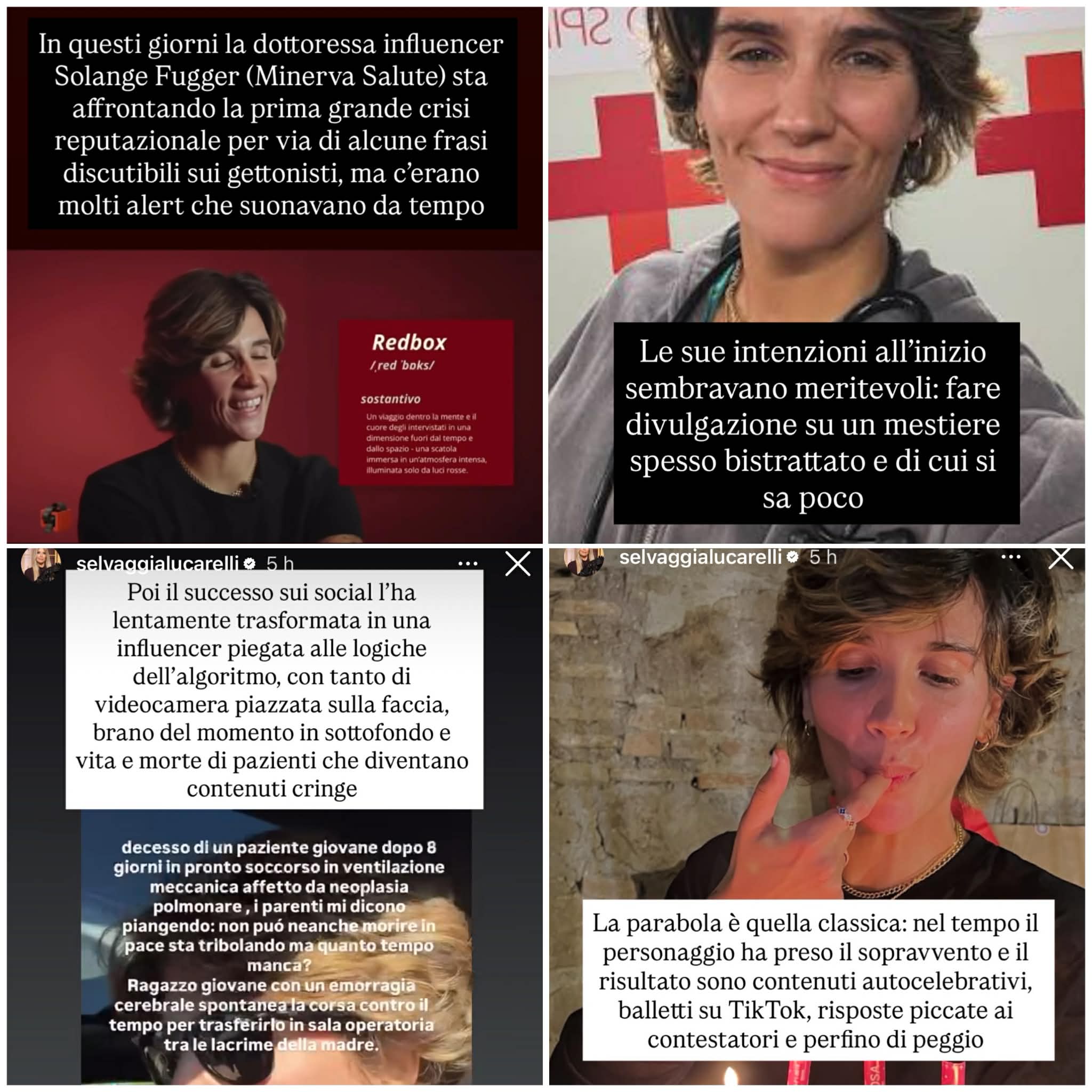 L’articolo completo lo ha pubblicato sulla sua newsletter Vale Tutto, ma sui social ha un po’ anticipato l’argomento: “In questi giorni la dottoressa influencer Solange Fugger (Minerva Salute) sta affrontando la prima grande crisi reputazionale per via di alcune frasi discutibili sui gettonisti, ma c’erano molti alert che suonavano da tempo. Le sue intenzioni all’inizio sembravano meritevoli: fare divulgazione su un mestiere spesso bistrattato e di cui si sa poco. Poi il successo sui social l’ha lentamente trasformata in una influencer piegata alle logiche dell’algoritmo, con tanto di videocamera piazzata sulla faccia, brano del momento in sottofondo e vita e morte dei pazienti che diventano contenuti cringe. La parabona è quella classica: nel tempo il personaggio ha preso il sopravvento e il risultato sono contenuti auto-celebrativi, balletti su TikTok, risposte piccate ai contestatori e perfino di peggio“.