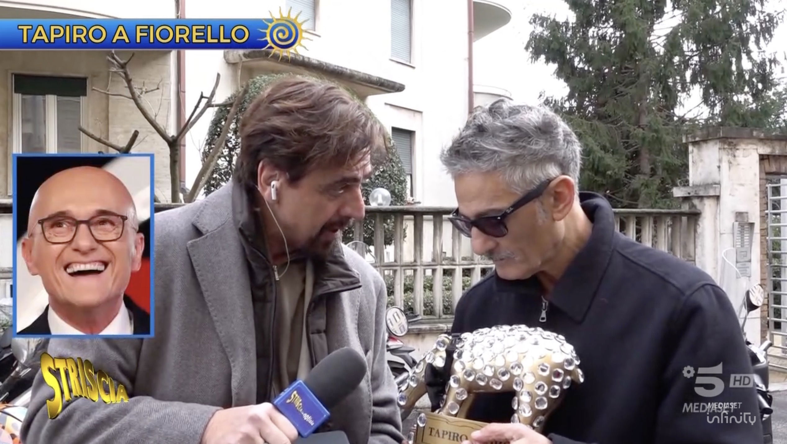Staffelli ha spiegato di aver pensato a Fiorello per il primo tapiro del 2026, perché non è finito invischiato in nessuno scandalo e – al contrario di Greggio – ha invece nominato Fabrizio Corona: “Sono pronto per la prima consegna dell’anno. E sapete a chi andrà? A un famosissimo showman, al numero uno dei conduttori, a uno sfavillante straordinario anchorman. In questo momento lui non è in mezzo agli scandali, non è nell’elenco di Bellavia, non è neanche nell’archivio segreto di Fabrizio Corona e lui si sente un po’ fuori dai giochi. Quindi sarà sicuramente attapirato perché in questo momento di scandali e rivelazioni, nessuno lo considera“.