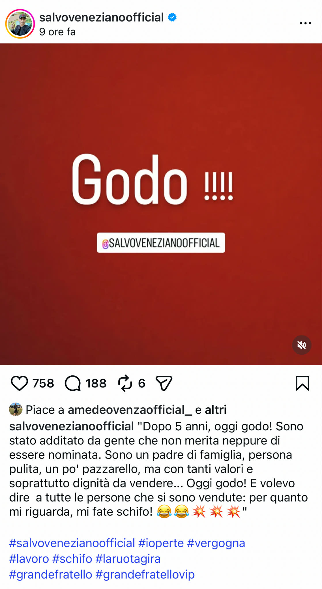 Il più pungente, però, è stato Salvo Veneziano, che prima ha condiviso il post di Stefano Bettarini e poi ha scritto su Instagram: “Godo! Dopo cinque anni oggi godo. Sono stati additato da gente che non merita neppure di essere nominata. Sono un padre di famiglia, persona pulita, un po’ pazzerello, ma con tanti valori e soprattutto dignità da vendere. Oggi godo! E volevo dire a tutte le persone che si sono vendute: per quanto mi riguarda mi fate schifo! #Schifo #LaRuotaGira #GrandeFratelloVip“.