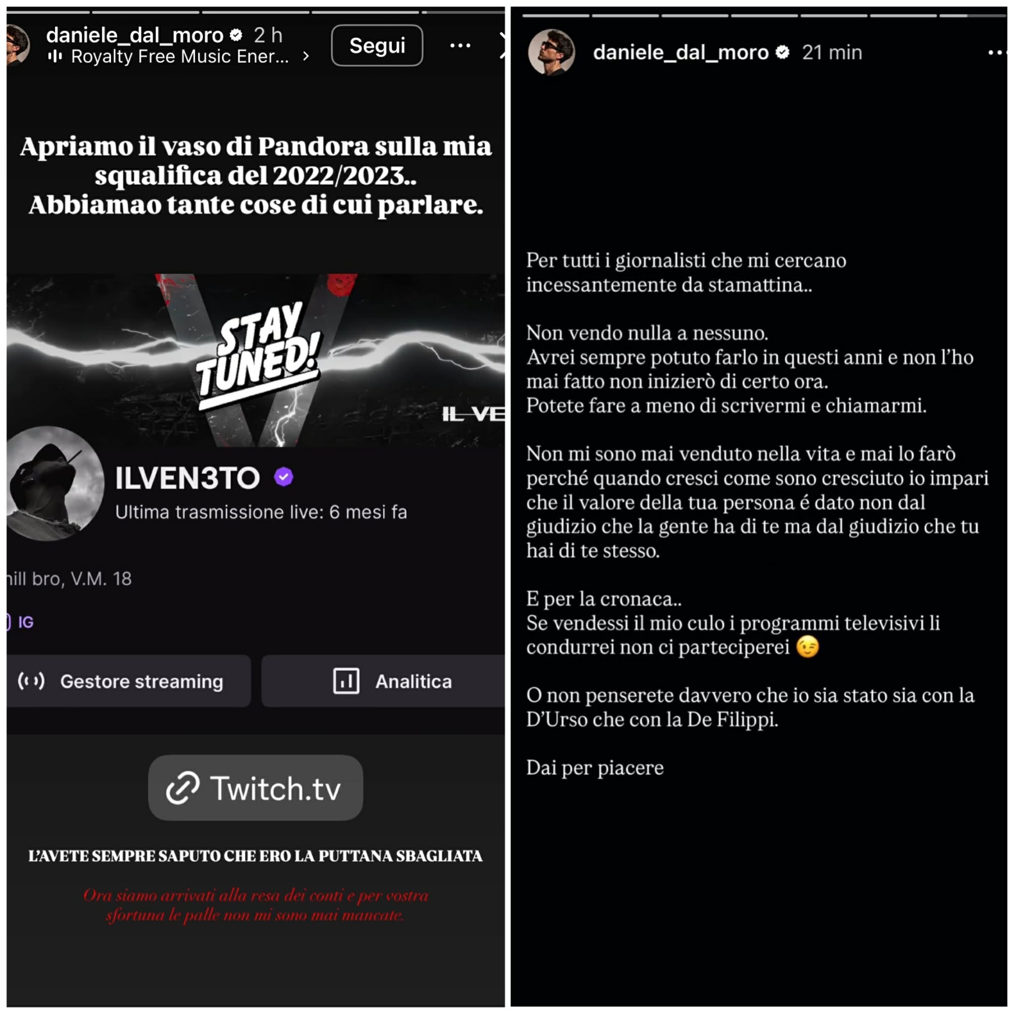 Daniele Dal Moro ha pubblicato su Instagram una serie di storie. Nella prima ha scritto: “Apriamo il vaso di Pandora sulla mia squalifica del 2022/2023, abbiamo tante cose di cui parlare. L’avete sempre saputo che ero la putt*na sbagliata, ora siamo arrivati alla resa dei conti e per vostra sfortuna gli attributi non mi sono mai mancati“. Nella seconda ha invece scritto: “Per tutti i giornalisti che mi cercano incessantemente da stamattina.. Non vendo nulla a nessuno. Avrei sempre potuto farlo in questi anni e non l’ho mai fatto non inizierò di certo ora. Potete fare a meno di scrivermi e chiamarmi. Non mi sono mai venduto nella vita e mai lo farò perché quando cresci come sono cresciuto io impari che il valore della tua persona é dato non dal giudizio che la gente ha di te ma dal giudizio che tu hai di te stesso. E per la cronaca… Se vendessi il mio qulo i programmi televisivi li condurrei non ci parteciperei. O non penserete davvero che io sia stato sia con la d’Urso che con la De Filippi. Dai per piacere“. Infine, nella terza, ha condiviso uno screen di una chat WhatsApp con Alfonso Signorini in cui gli scrive “Qualcuno la pagherà per questo schifo, siete una vergogna” alludendo proprio alla sua squalifica.