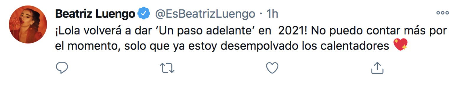 Nei giorni scorsi ha iniziato a circolare un tweet dell’attrice Beatriz Luengo che annunciava il comeback della serie: “Lola tornerà a Un Paso Adelante nel 2021! Per il momento non vi posso raccontare molto di più, soltanto che sto scaldando i motori!”