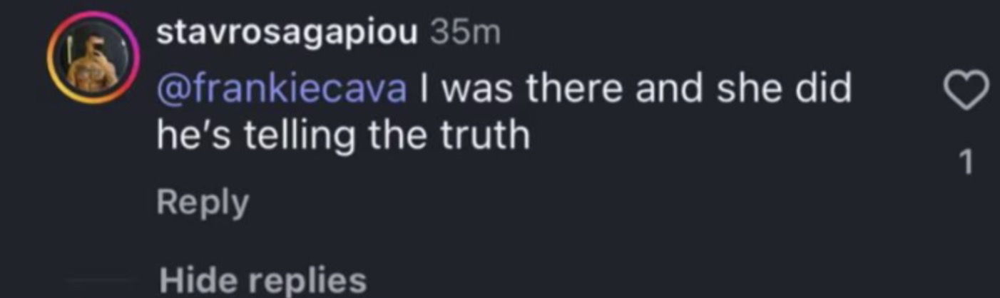 Questa versione è stata commentata da Jack Remington che ha fatto un video sui social. A rispondere è stato anche Stavros Agapiu, fidanzato di Dj Fat Tony, che ha sottoscritto tutto. “Ero lì e sì, è successo davvero, sta dicendo la verità“. Un commento che ha poi modificato in un più politicamente corretto: “Ha fatto bene a parlarne, finalmente“.
