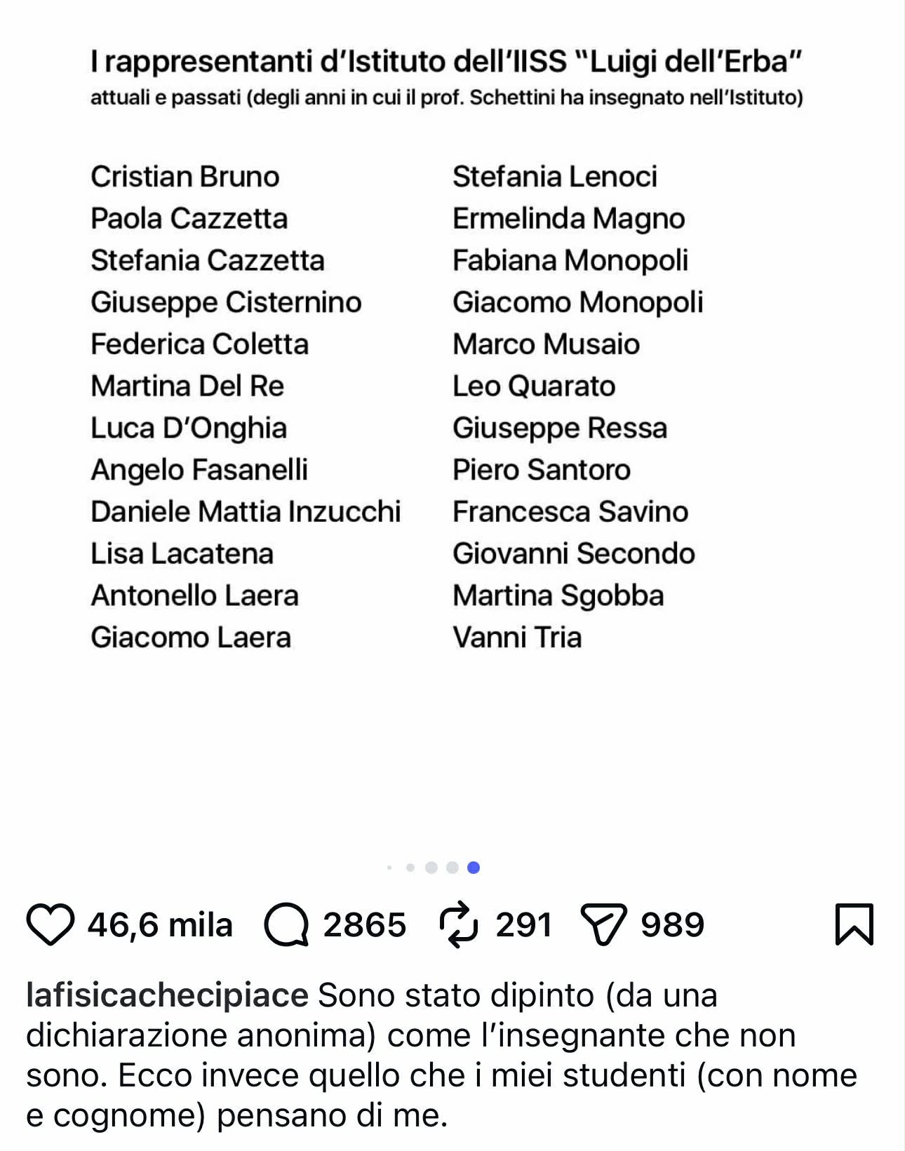 “Come rappresentanti ed ex rappresentanti d’Istituto dell’ISS “Luigi dell’Erba” di Castellana Grotte (BA), sentiamo il dovere di dissociarci dall’immagine negativa del prof. Schettini che sta circolando in rete, generata dalle dichiarazione anonime di un ex studente che dice che “in classe faceva video per YouTube al posto delle lezioni, assegnava voti in più tramite emoji, molti non parlano per paura”. Noi rappresentiamo e abbiamo rappresentato migliaia di studenti in questi anni e possiamo dire con certezza, visto che il prof. Schettini è stato docente di fisica di molti di noi rappresentanti d’Istituto e di tanti altri nostri compagni, che il prof si è sempre distinto per umanità e dedizione per l’insegnamento.